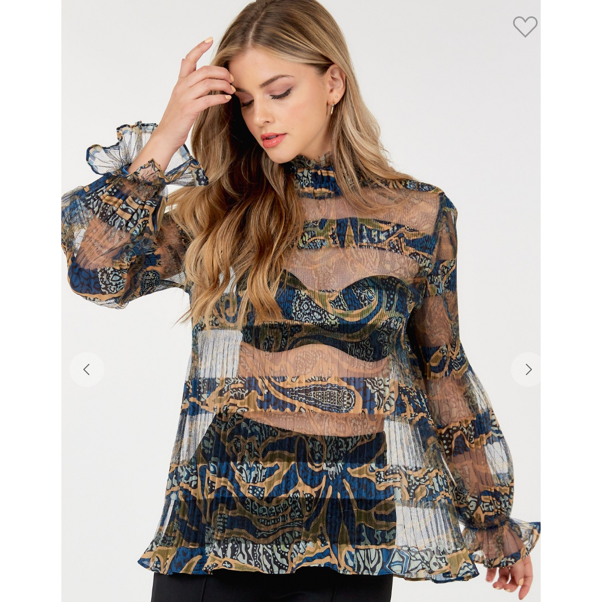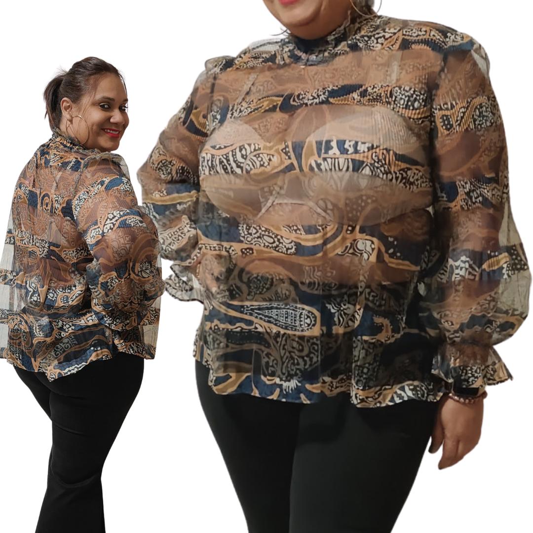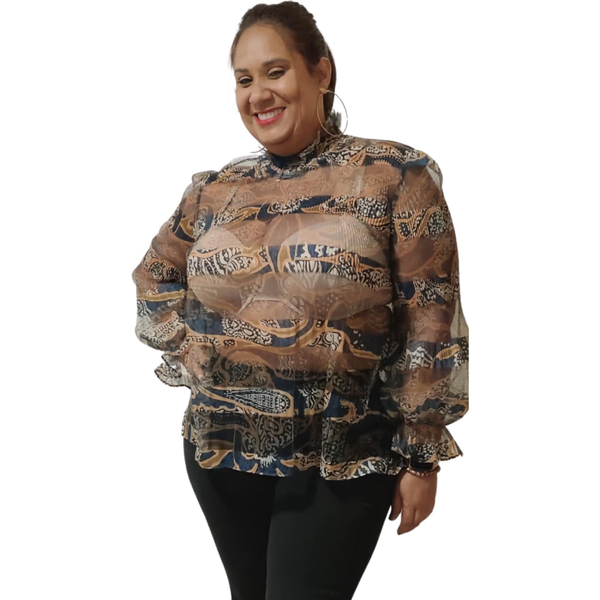 The Adeline blouse brings comfort and elegance together. Made with soft, sheer fabric, it features a printed pattern in warm tones, a frill collar, and flowy long sleeves. You can wear it loose for a relaxed look or add a belt to define your waist, perfect for any outing or family gathering.
