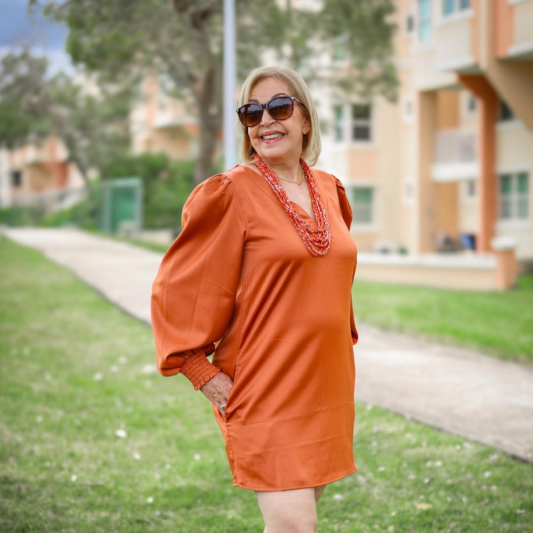 This rust-orange dress brings elegance with ease. Designed with a soft satin feel, it features a flattering V-neckline, long puffed sleeves with smocked cuffs, and a straight, relaxed fit that works beautifully on all body types.