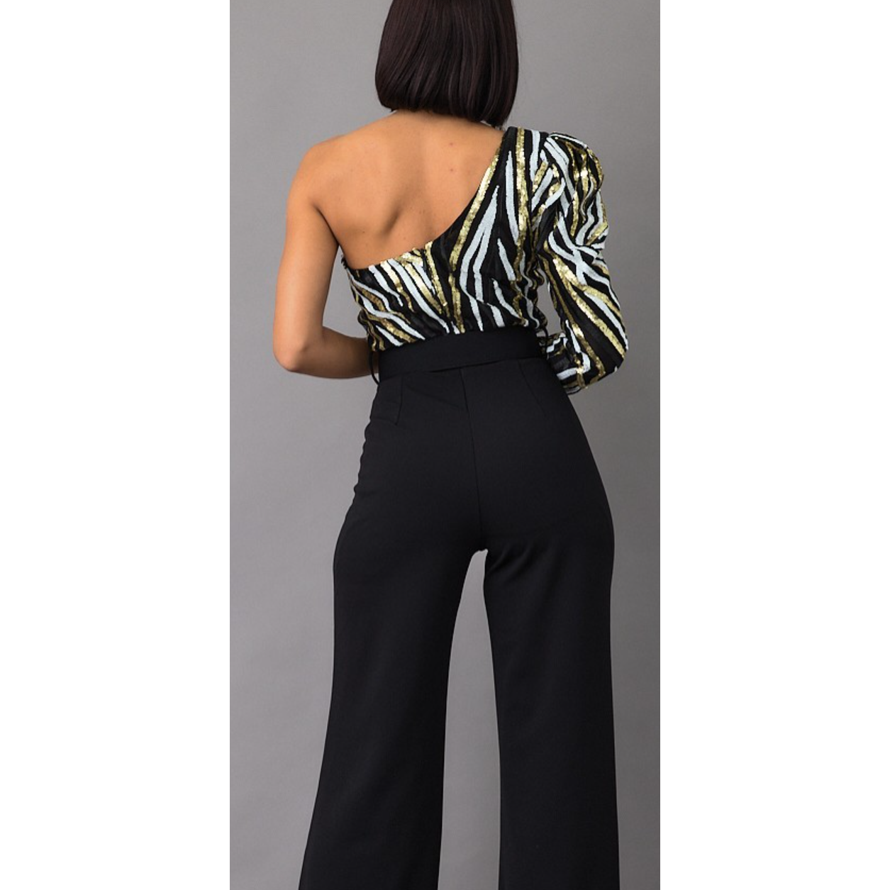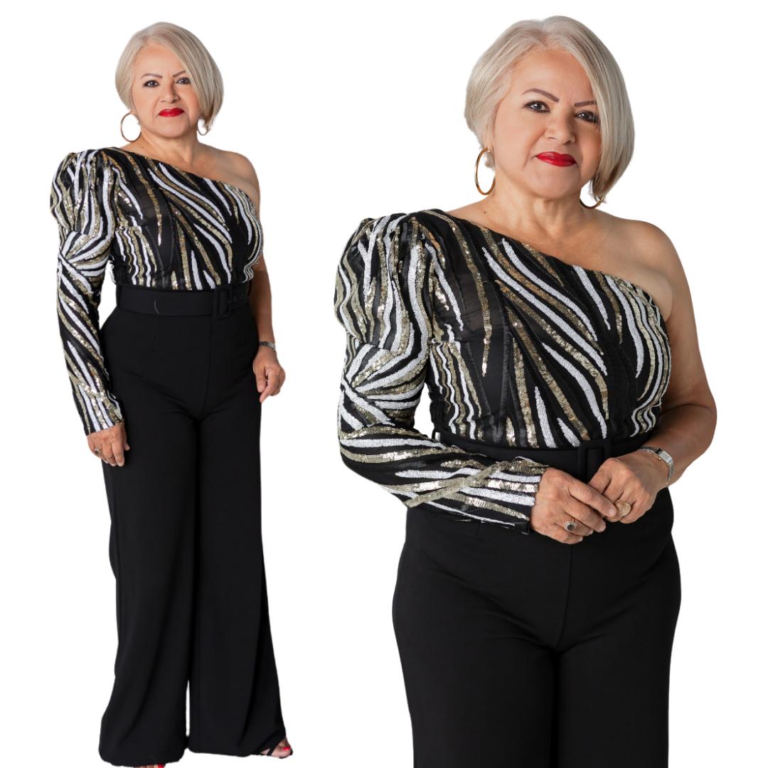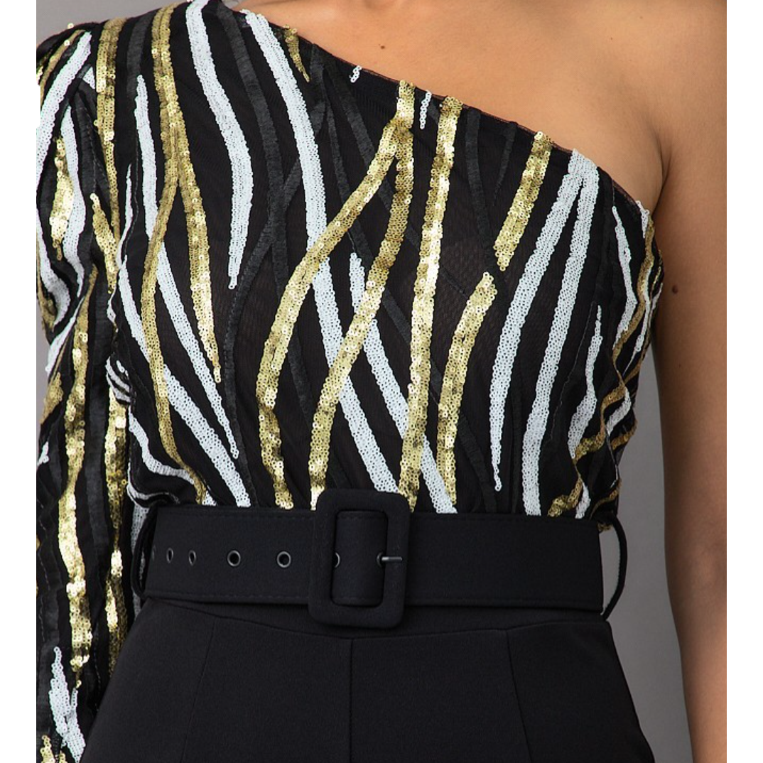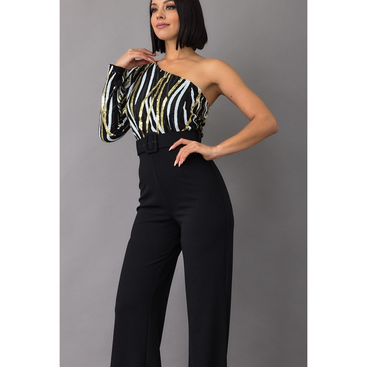 One-shoulder sequins top fashion jumpsuit; belt detail, zipper in the back. 95% Polyester 5% Spandex. Hand wash cold, do not bleach, and air dry flat.