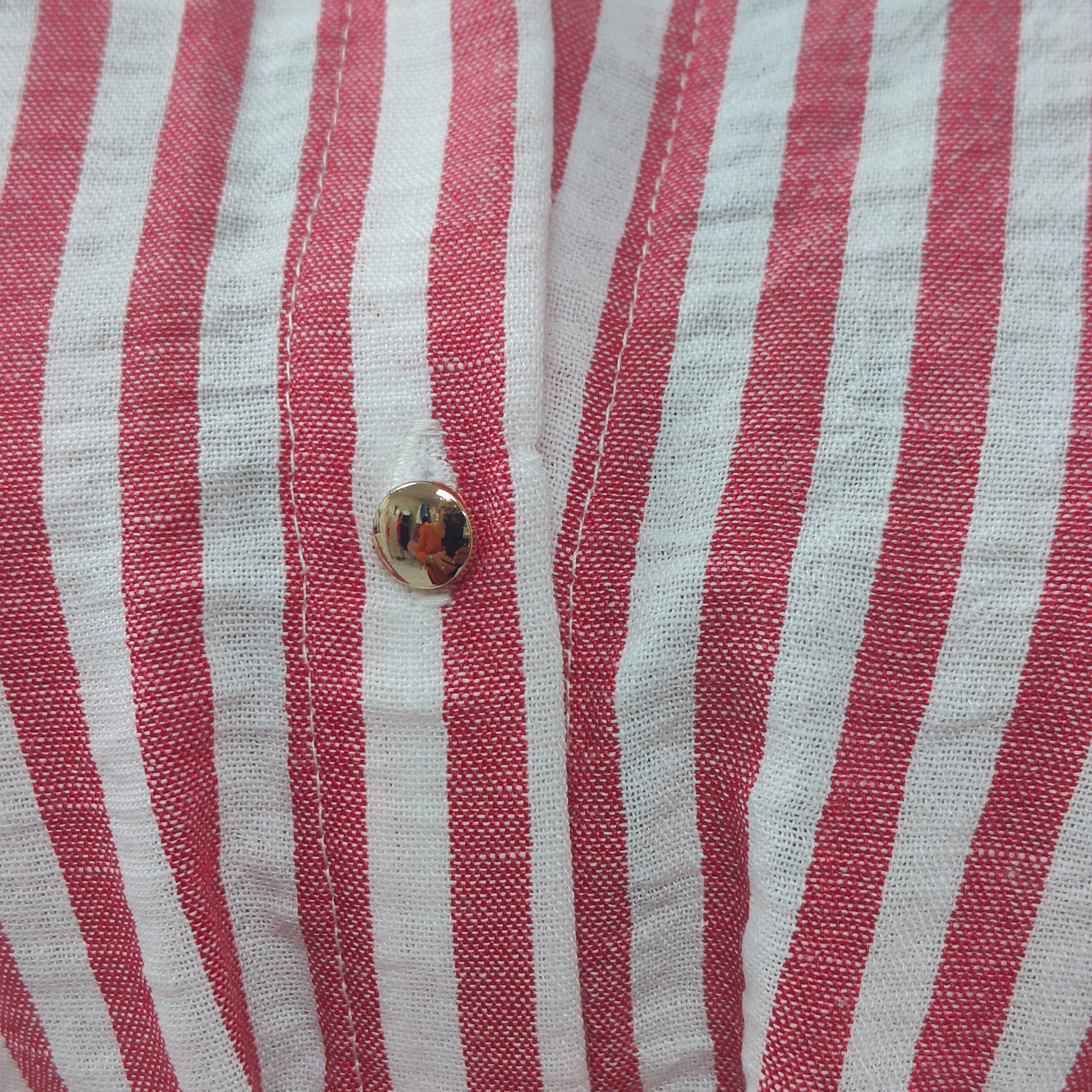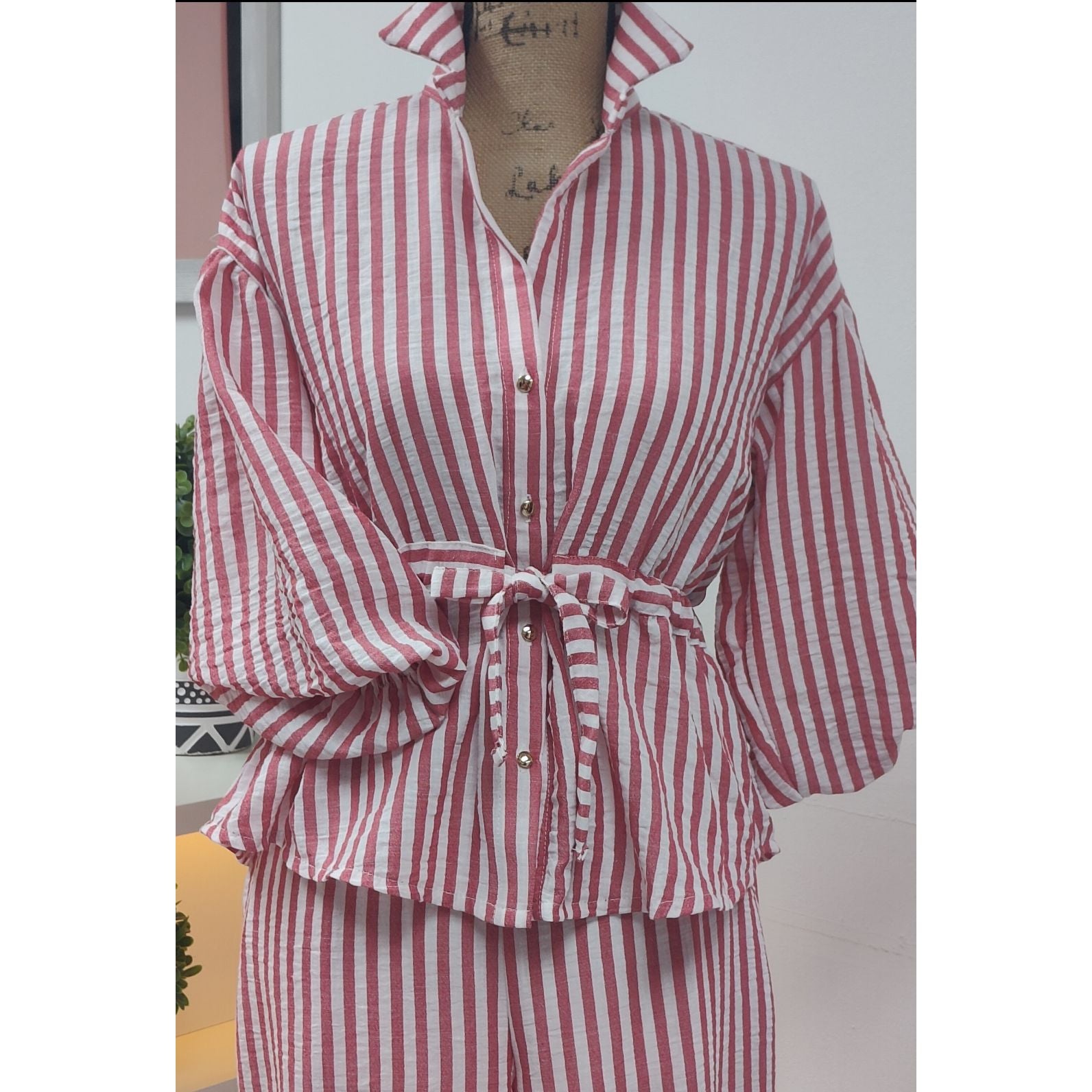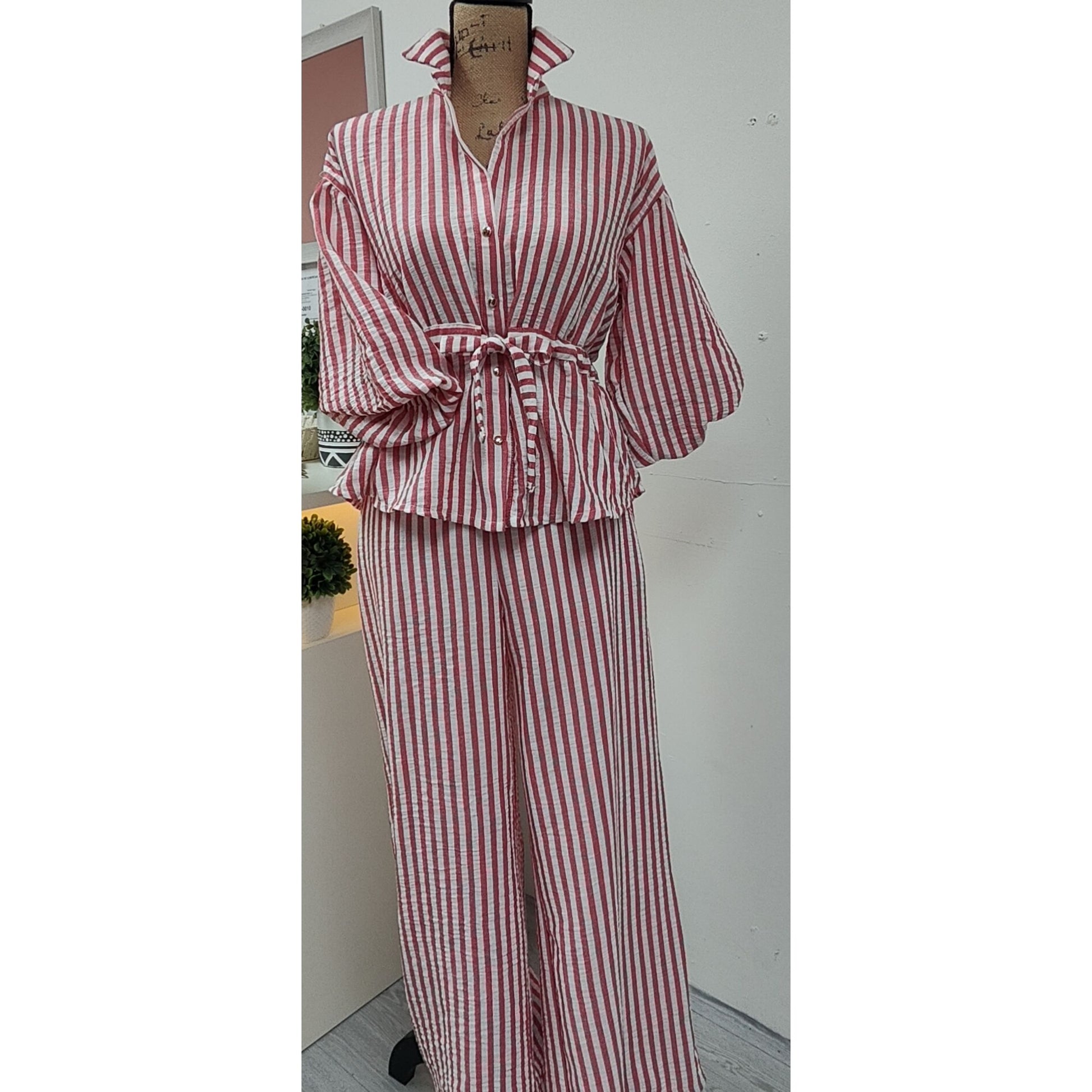 This pant set blends fresh style with effortless comfort. Designed with vertical red and white stripes, it creates a modern, elongating silhouette. The top features a classic collar, front button-down closure, and long, slightly voluminous sleeves that add a touch of sophistication. Self-tie belt to cinch the waist and enhance the figure.