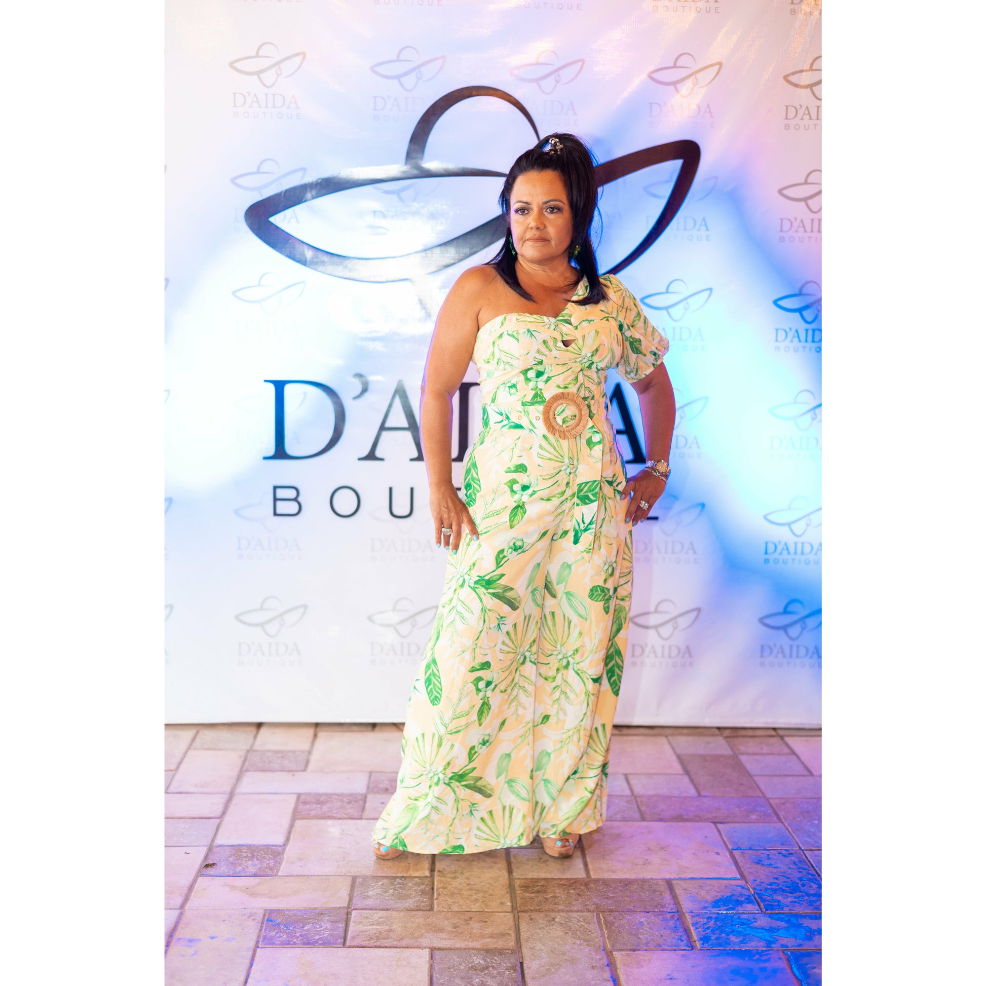 Floral printed jumpsuit with one side off shoulder design, wide leg bottom, fitted waist with a hoop decor belt. 97%polyester 3%spandex