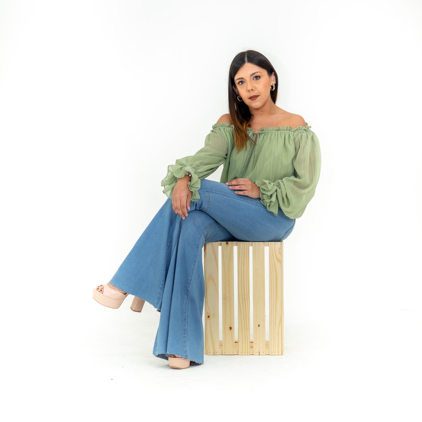 Solid woven top featuring off shoulder neckline with tie, long sleeve with elasticezed cuff and elasticized waist. 5'3" Model wearing small