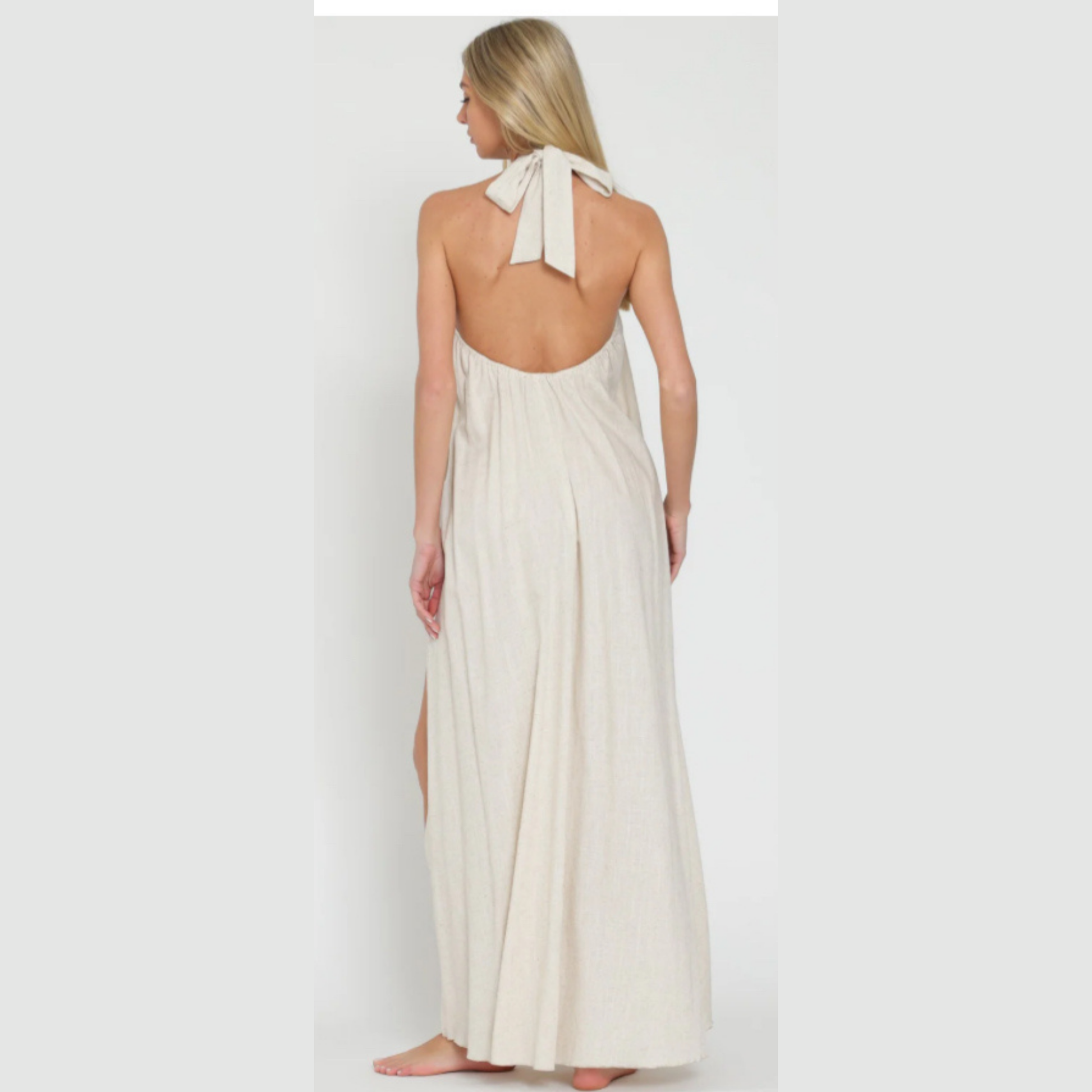 This Halter Backless Maxi Dress in a refined oatmeal hue combines elegance with comfort. Crafted from a soft blend of 70% rayon and 30% linen, it offers a relaxed fit that drapes beautifully. Side slits add subtle movement, while functional pockets enhance practicality. The adjustable bow at the back of the neck ensures a tailored fit, and the dress runs true to size, making it a sophisticated choice for any occasion.