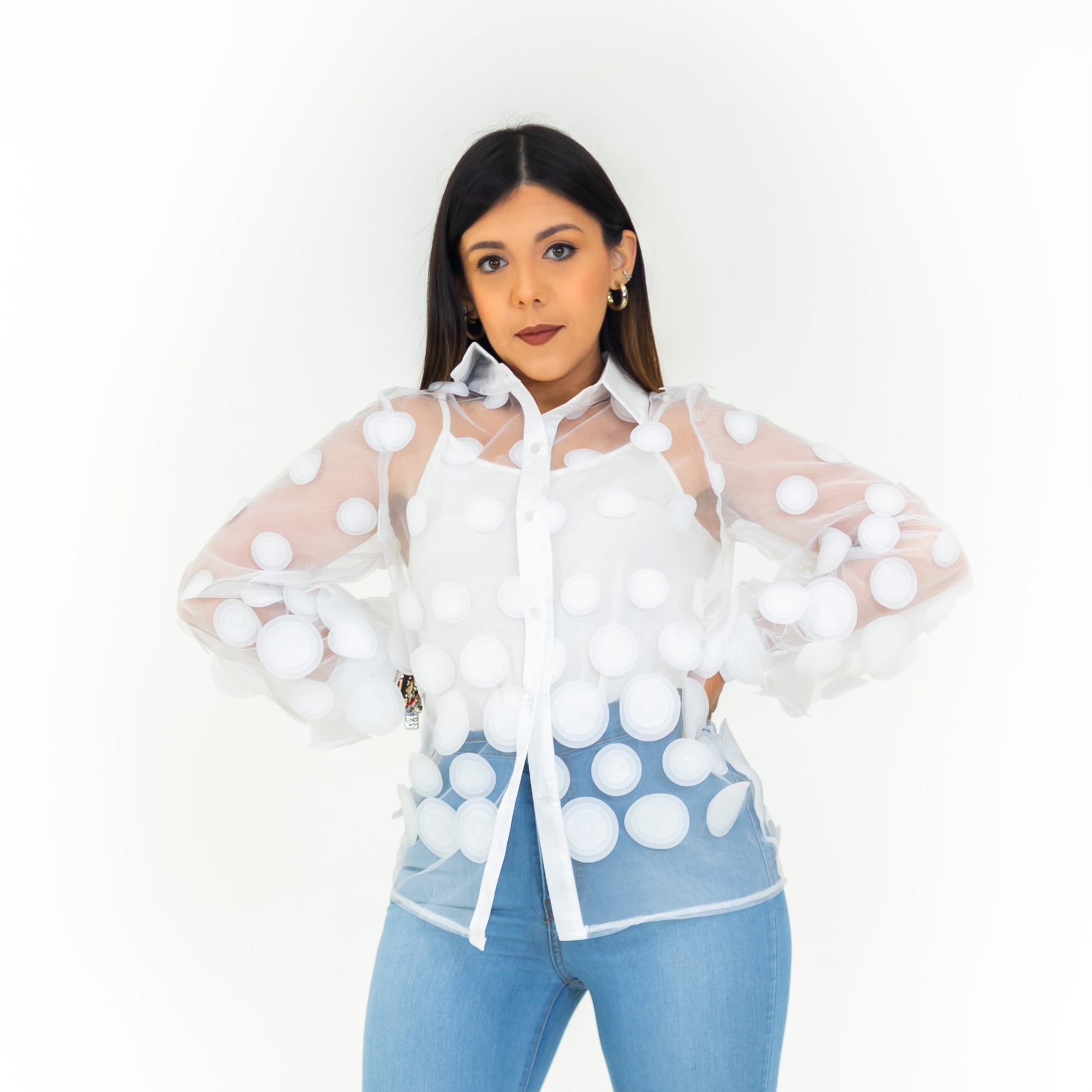 Circle embellishments detail mesh shirt. Gracia brand means quality! 5'3" model wearing small