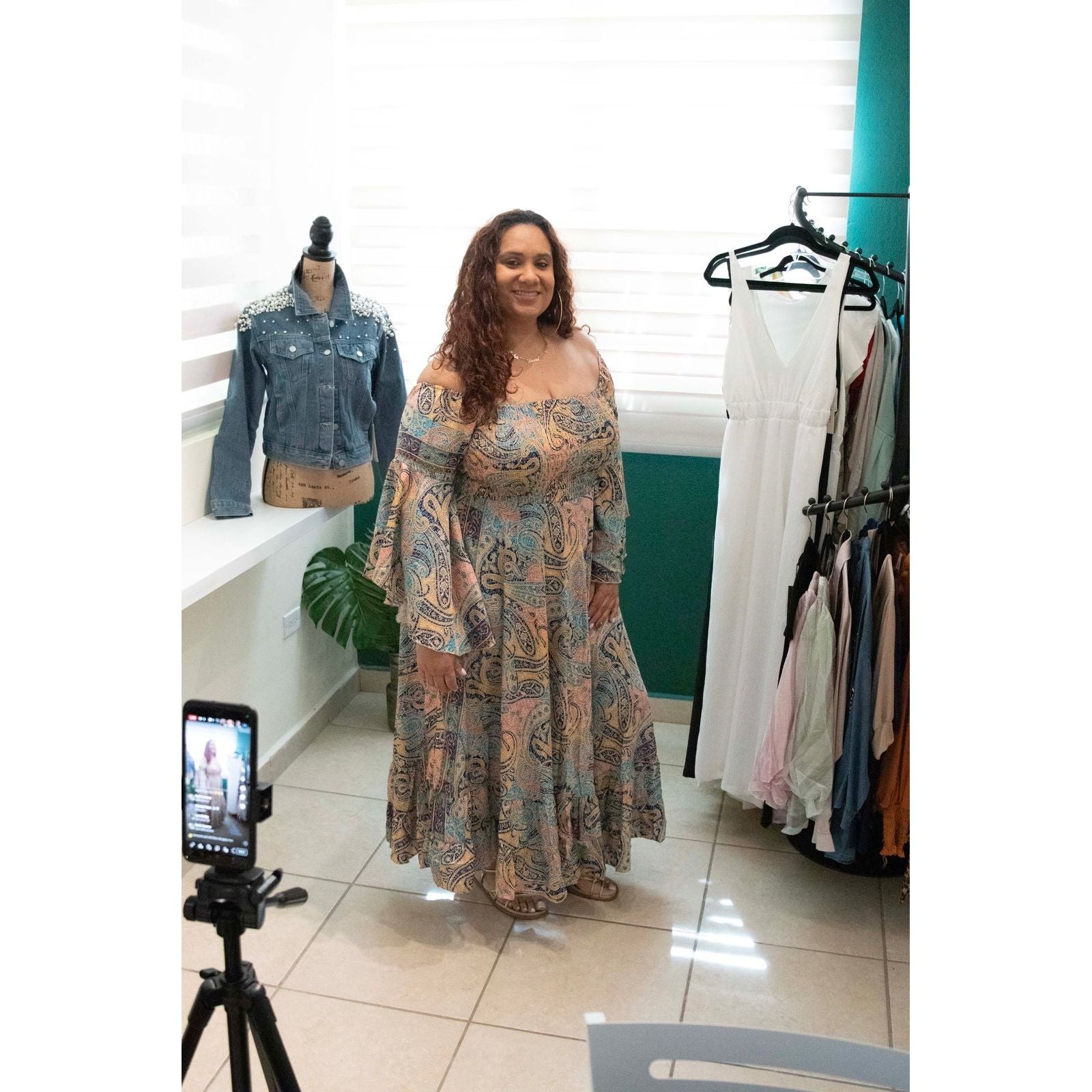 Long dress; bohemian-inspired made in India with a luxurious blend of 70% silk and 30% viscose. It features an off-the-shoulder neckline, giving it an elegant and feminine touch. The bell sleeves add a dramatic and flowy effect, enhancing its boho-chic aesthetic. The fabric showcases an intricate mix of earthy-toned prints, including geometric and paisley patterns. Different patterns