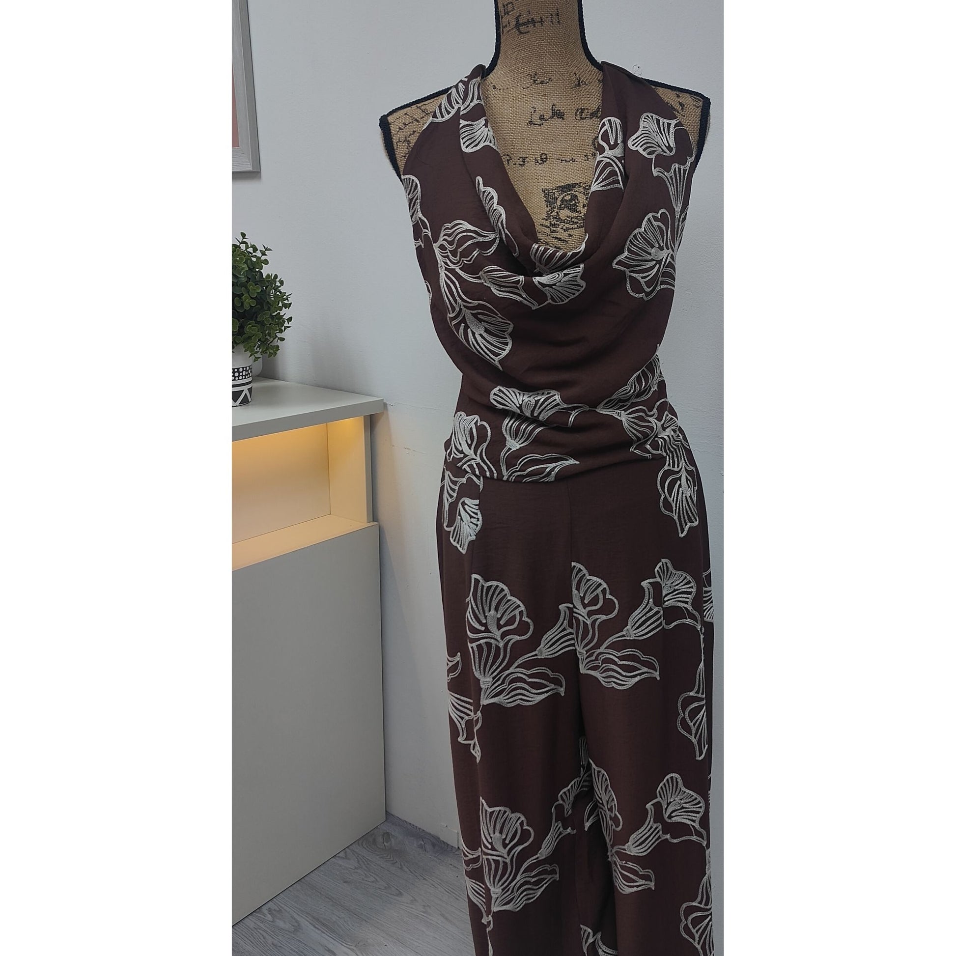This beautiful set features a halter top with a soft cowl neckline that adds an elegant, feminine touch. The light floral print contrasts perfectly with the rich brown base, creating a sophisticated yet tropical look.