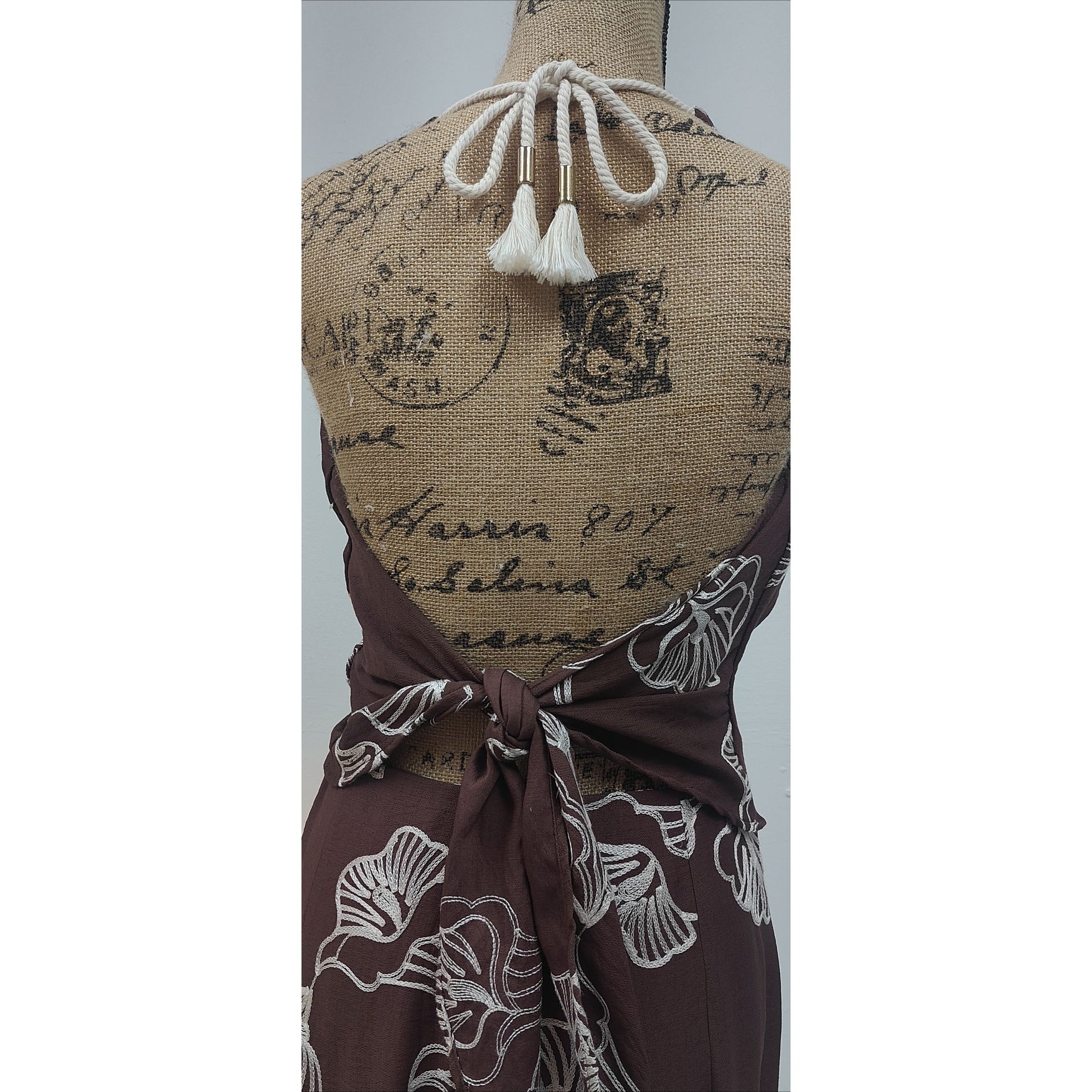 The back showcases an open design with an adjustable waist tie and a rope-style neck strap with delicate gold-tipped tassels, giving it a unique, handcrafted finish.