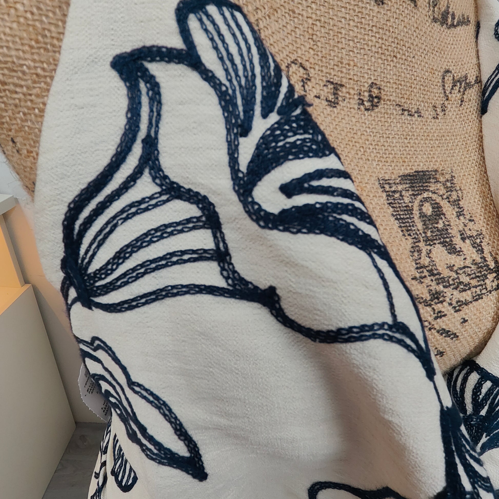 The standout detail is the bold embroidered floral patter.The embroidery is raised and dimensional, giving the design a rich, artisanal look. Each petal and line is created with thick, looped stitching that adds depth and a handcrafted feel.