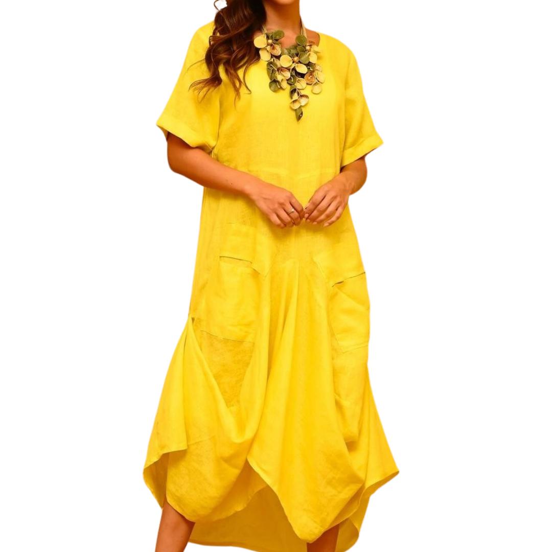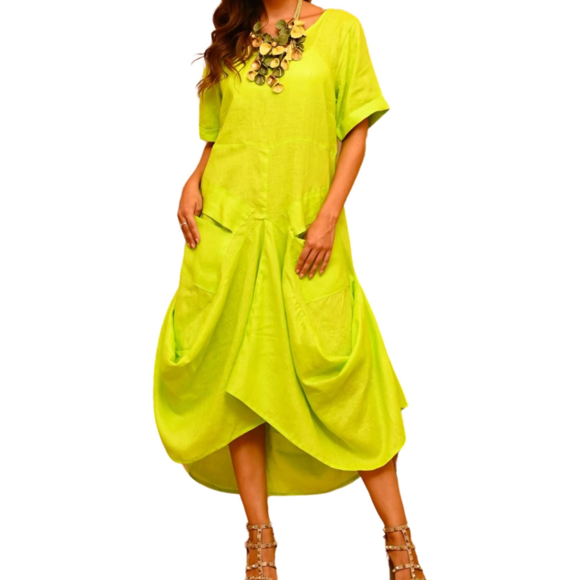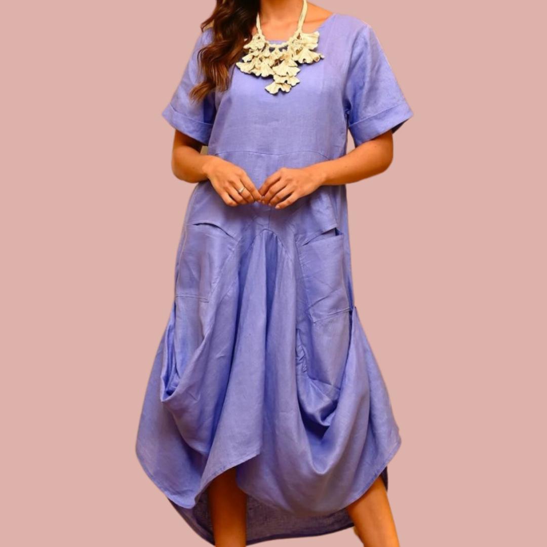 This charming dress features a balloon-shaped hemline, creating a voluminous and flowing effect that adds a unique and elegant touch to the garment. Made from 100% high-quality linen, this dress ensures a soft and comfortable feel against the skin, perfect for any occasion. And it has pockets!