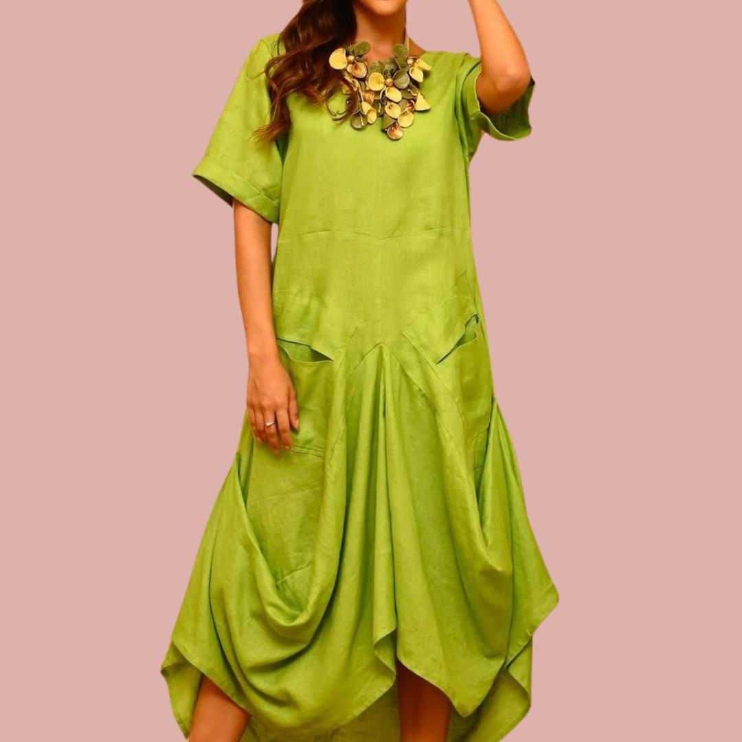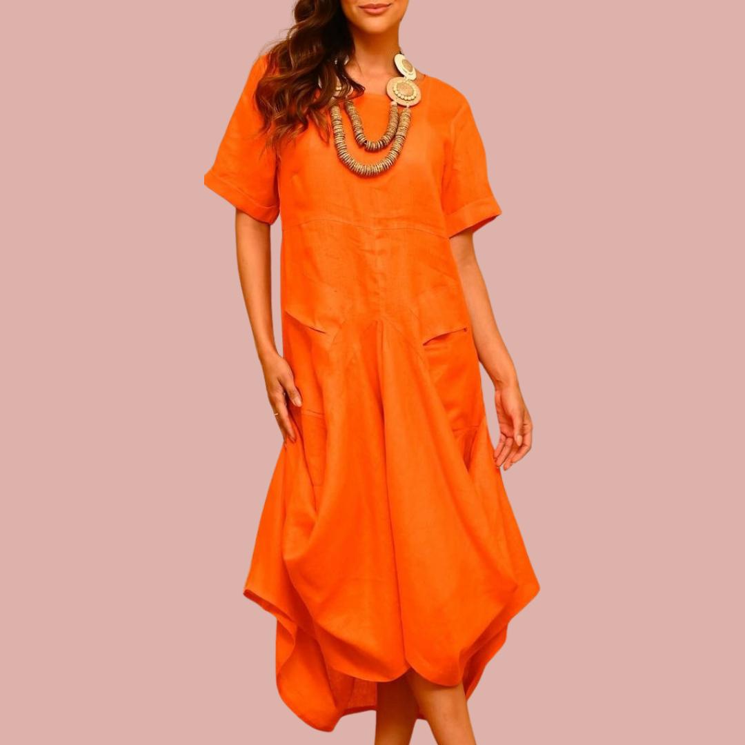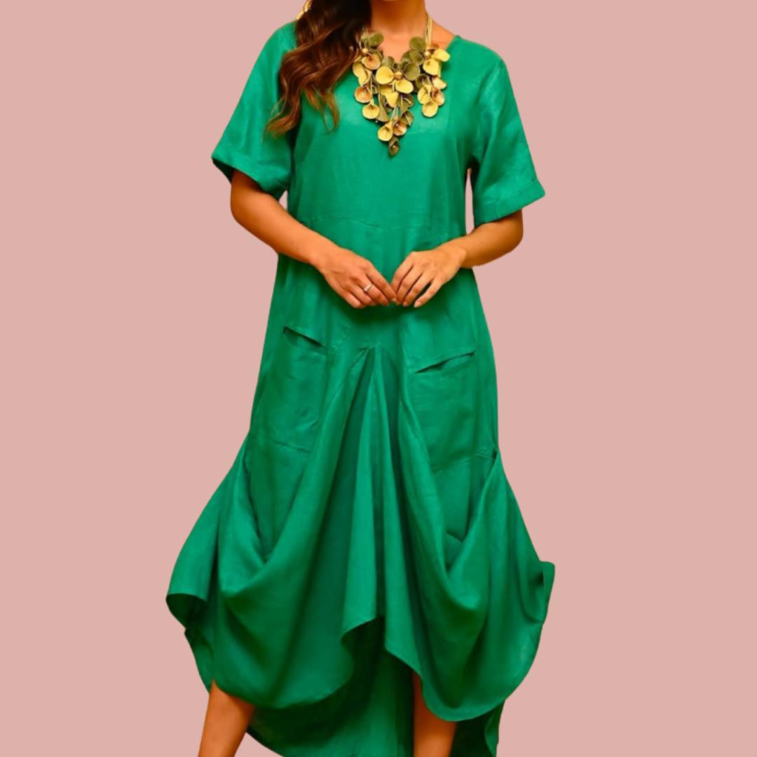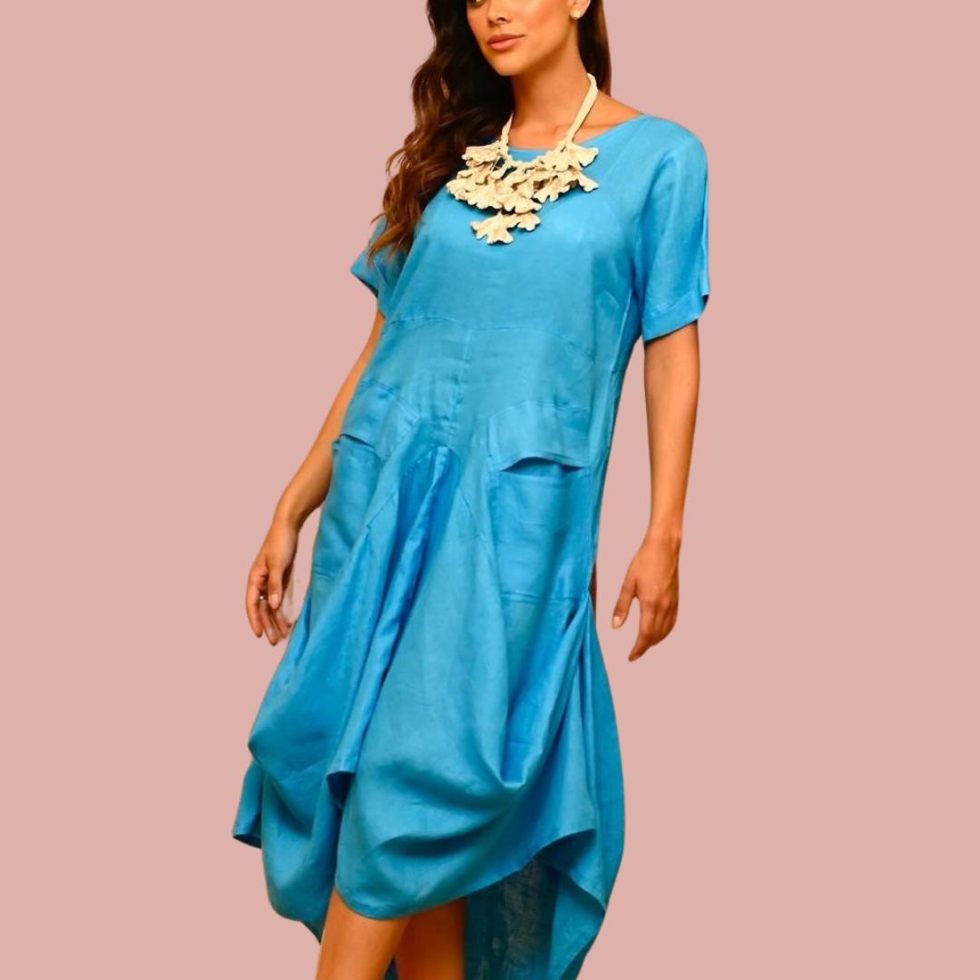 This charming dress features a balloon-shaped hemline, creating a voluminous and flowing effect that adds a unique and elegant touch to the garment. Made from 100% high-quality linen, this dress ensures a soft and comfortable feel against the skin, perfect for any occasion. And it has pockets!