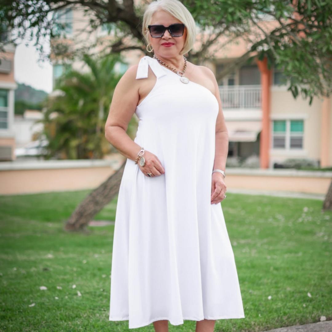 Our one shoulder knot midi dress is perfect for outdoor or indoor activity as it is completely lined.  Beautiful dress by one of our local fashion designers, Zoraida Collazo.