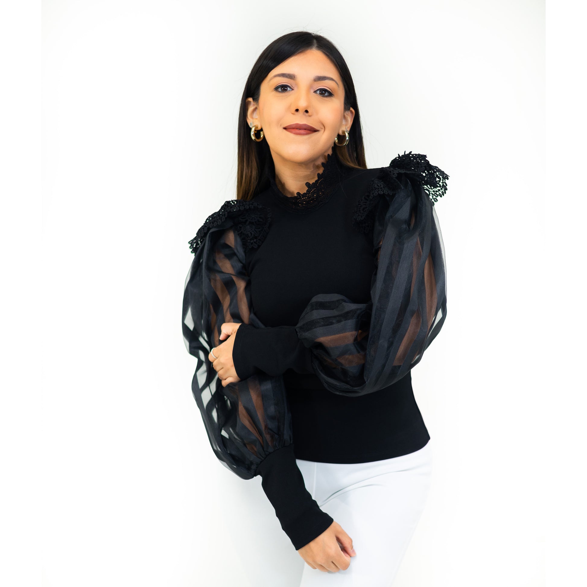 Fashion long sleeve top with crochet detail; see through organza stripe sleeve; 95% Polyester, 5% Spandex