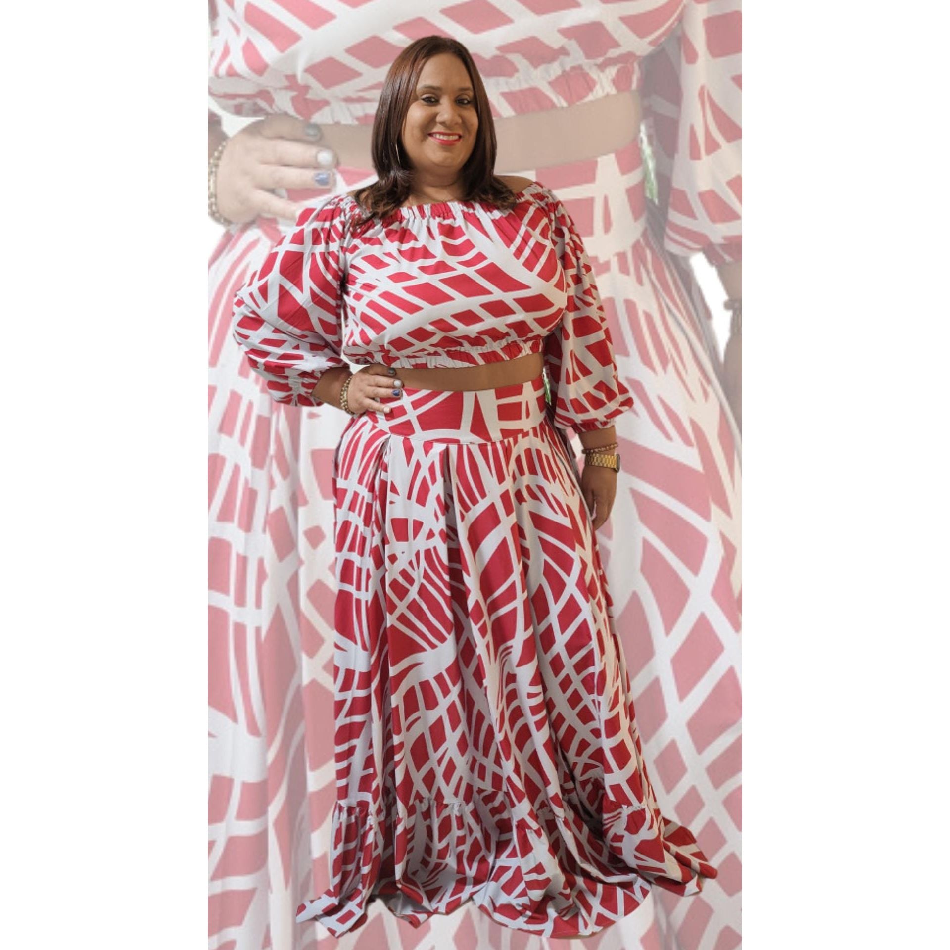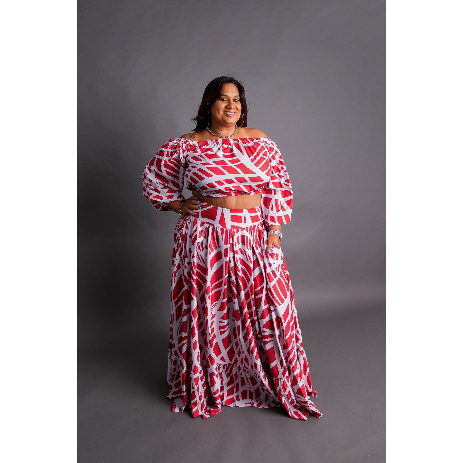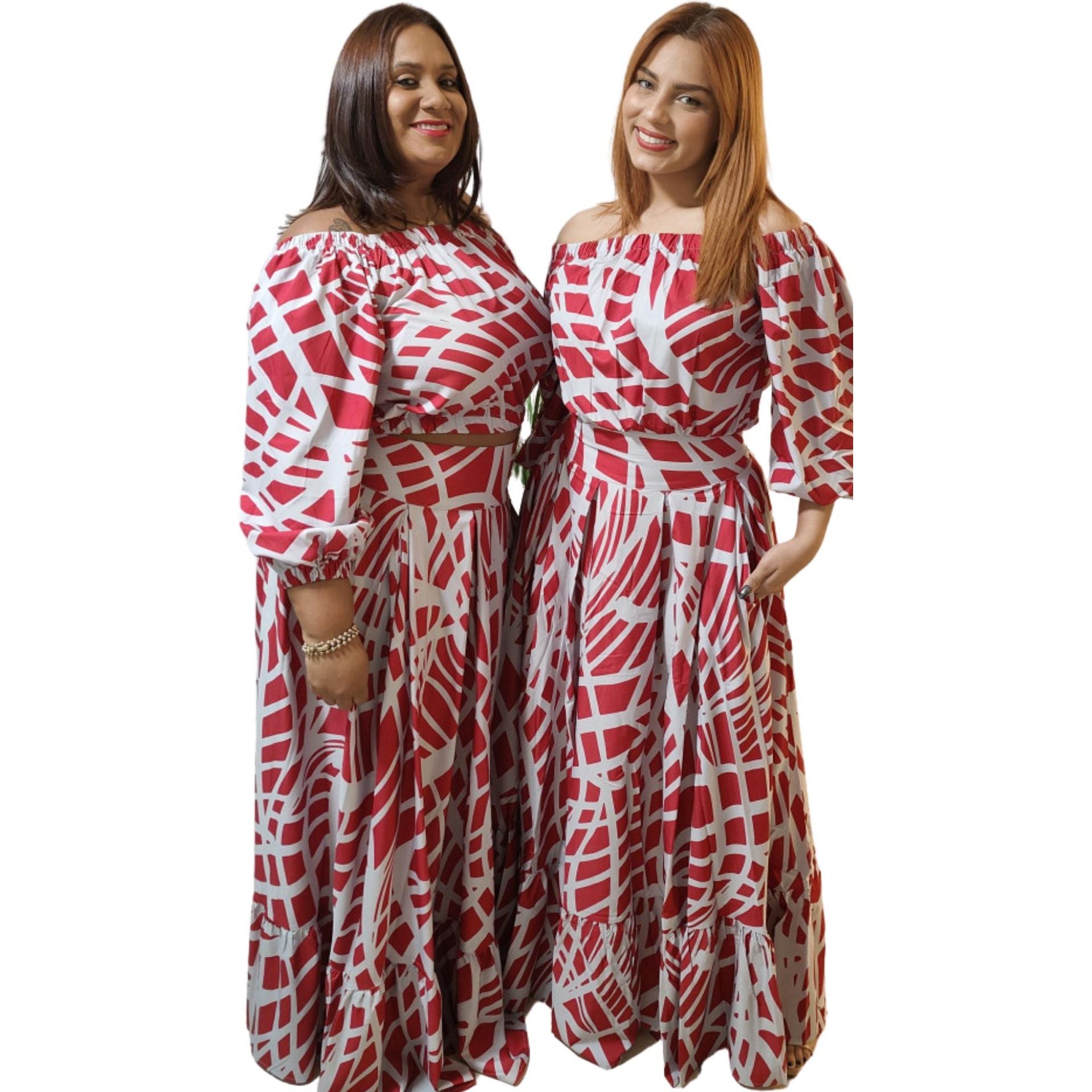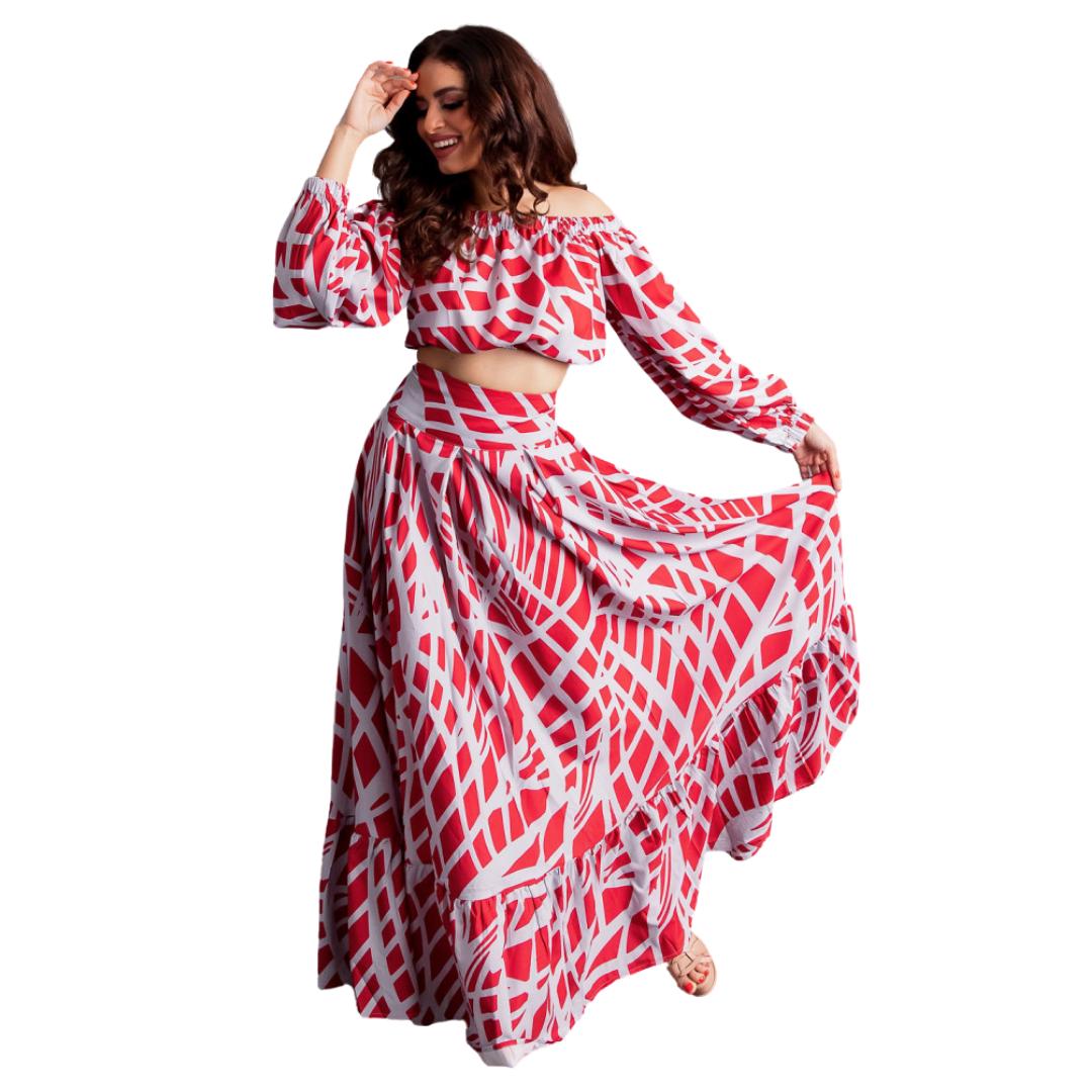 Off shoulder top and maxi skirt set; elastic band in both top and skirt - with pockets! 100% polyester.