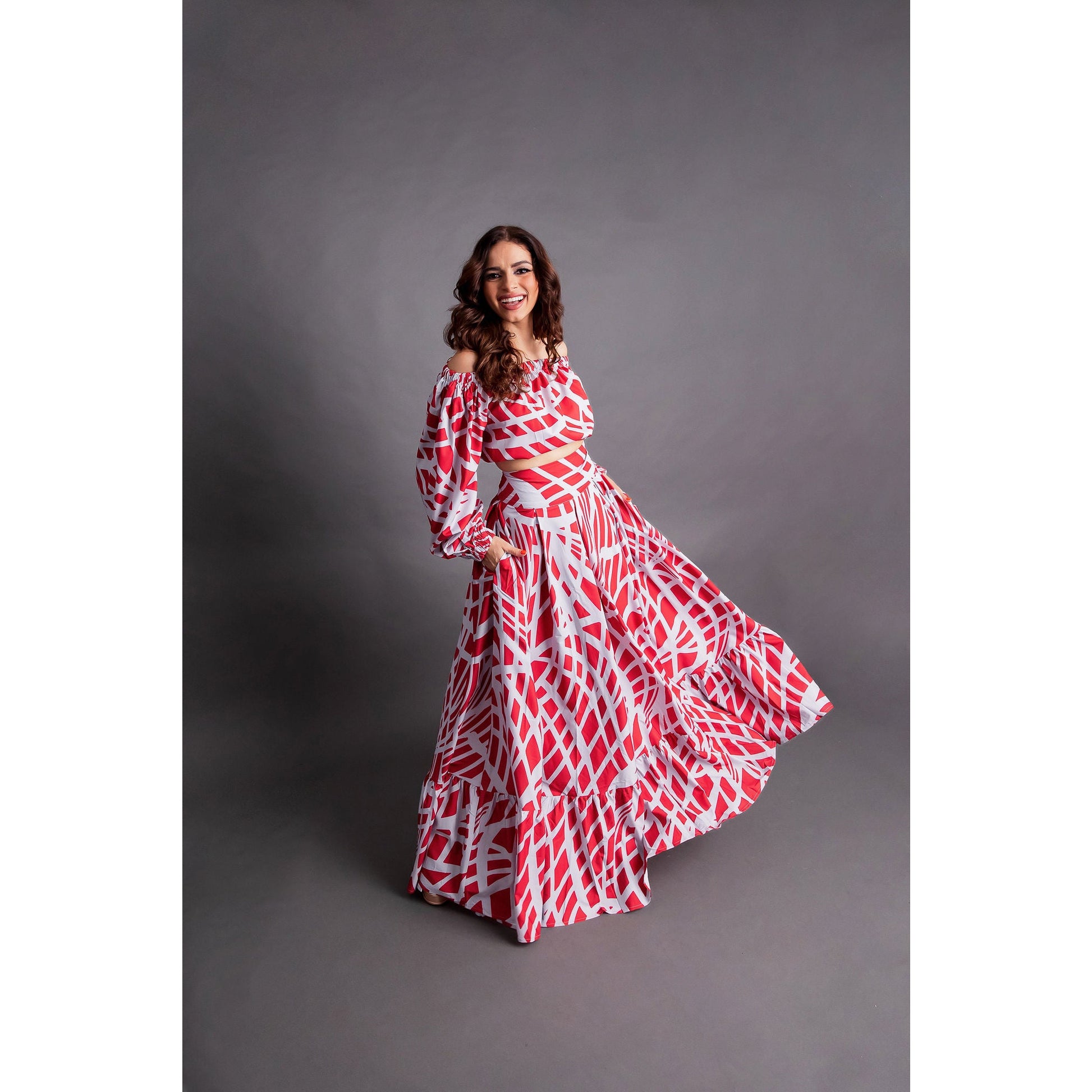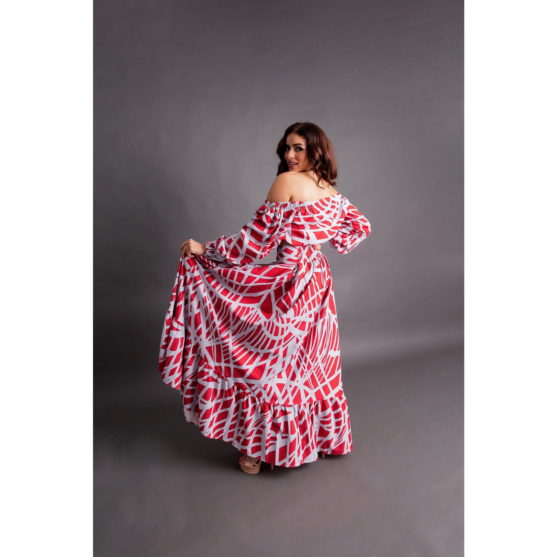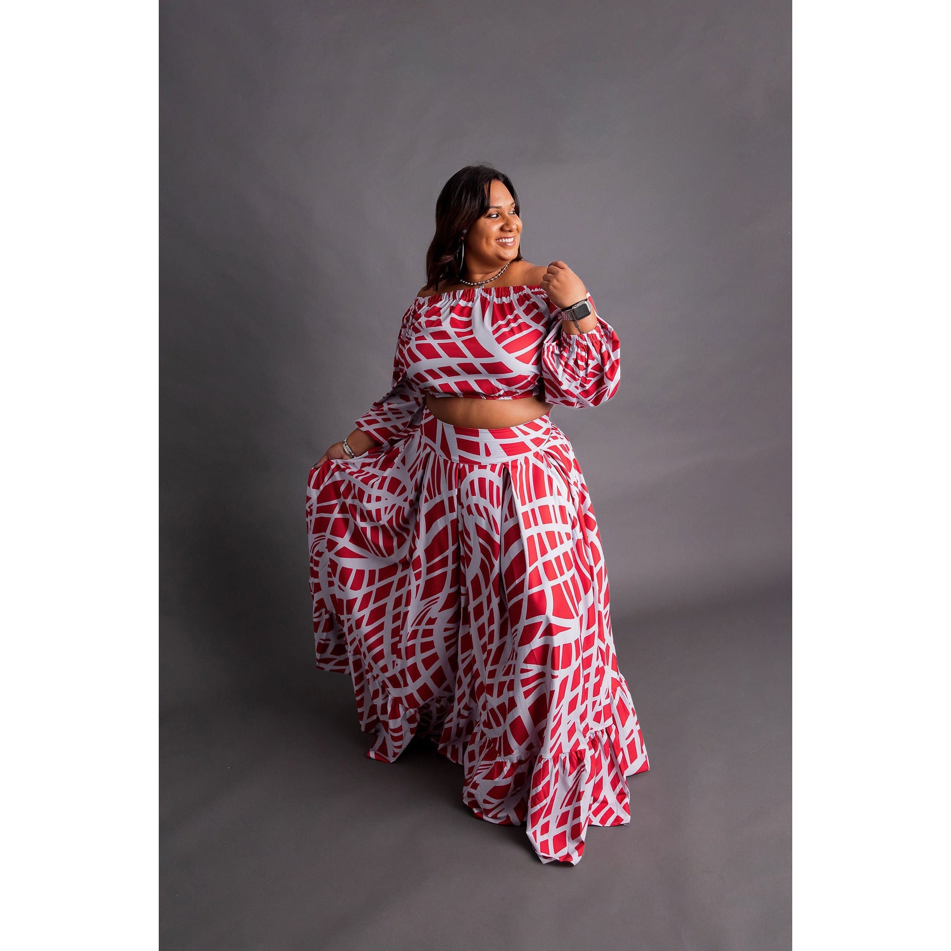 Off shoulder top and maxi skirt set; elastic band in both top and skirt - with pockets! 100% polyester.