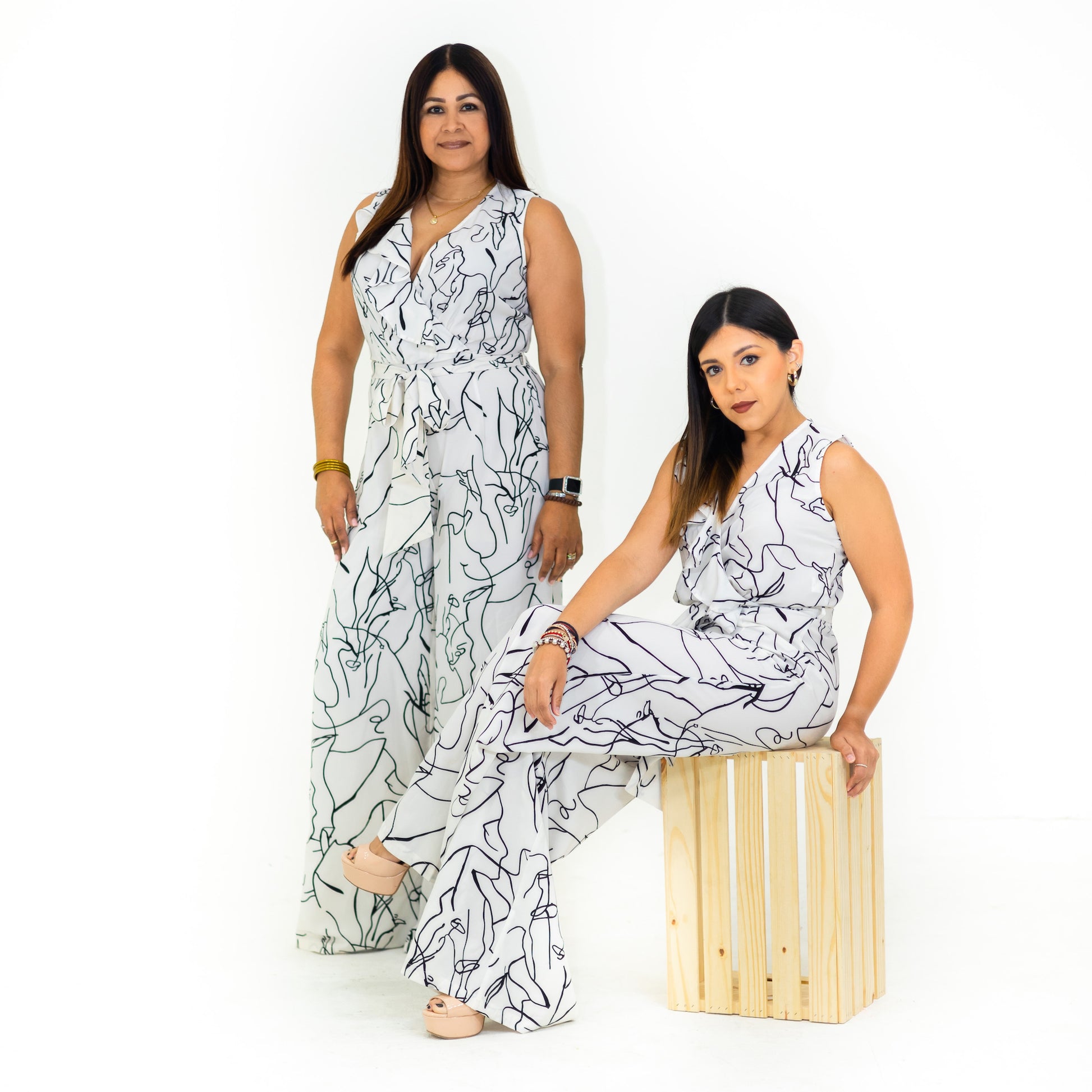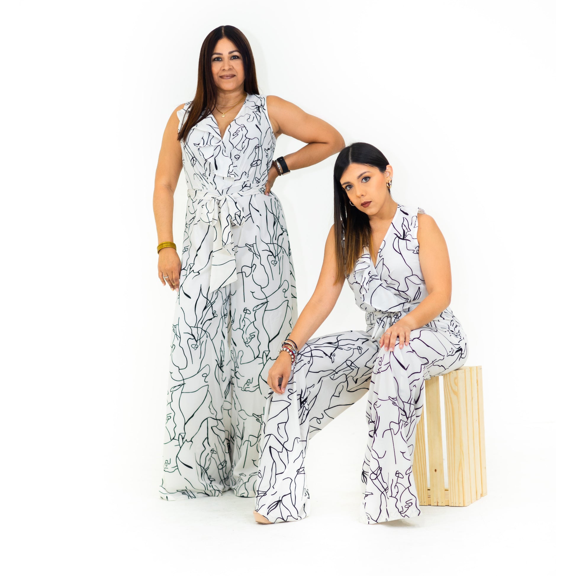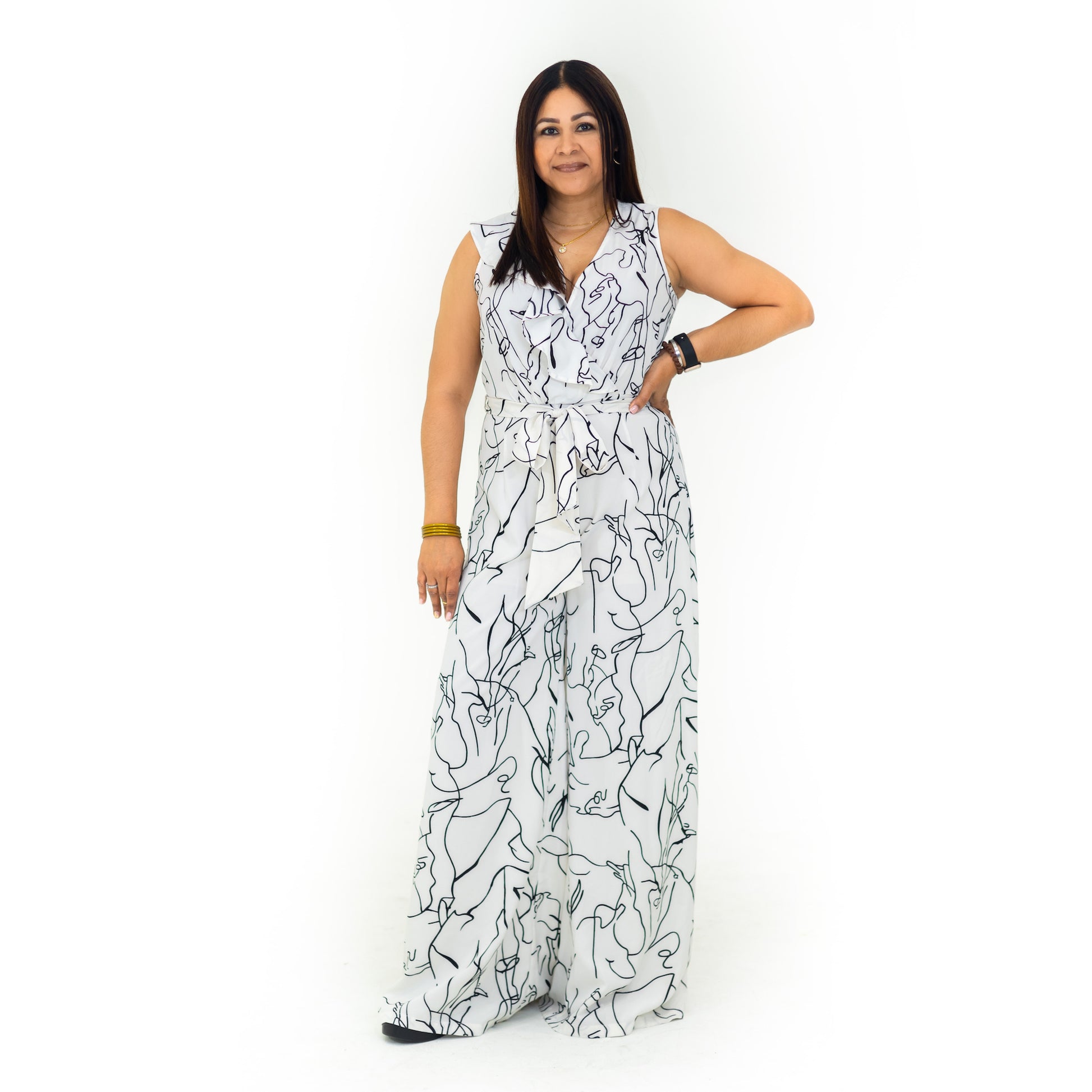 Ruffle detailed print fashion woven jumpsuit; belt detail. 100% polyester. 5'3" model wearing small; 5'8" model wearing large