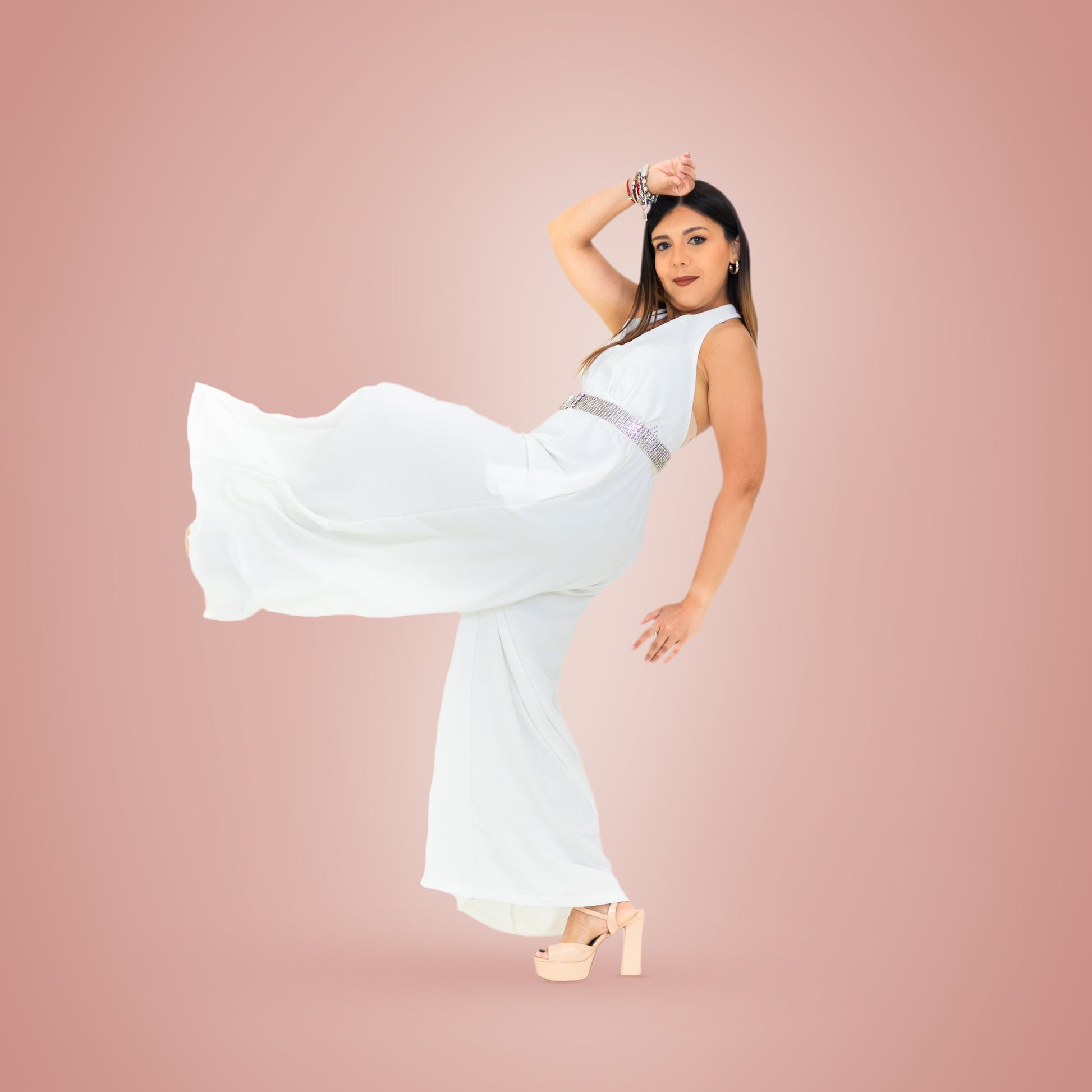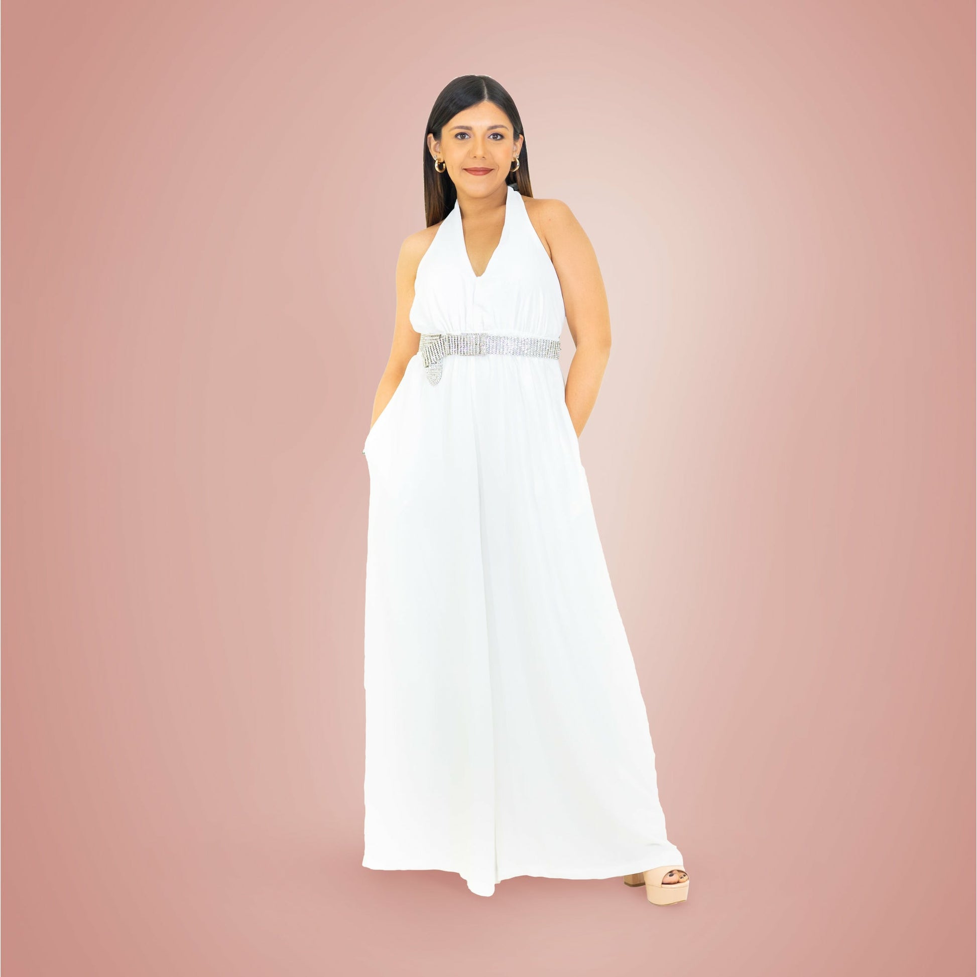 Jumpsuit; 100% polyester. Model is wearing medium. Also in black (not shown). Belt not included.